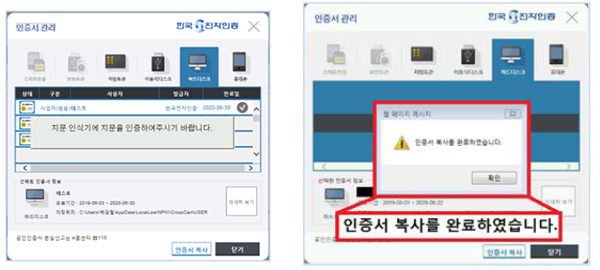 (1) 한국전자인증 홈페이지 > 5. 관리 > 2-1. 인증서 지문보안토큰 복사